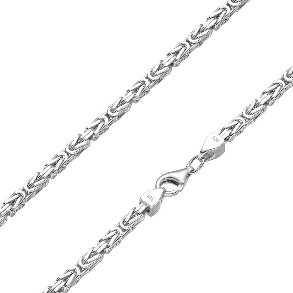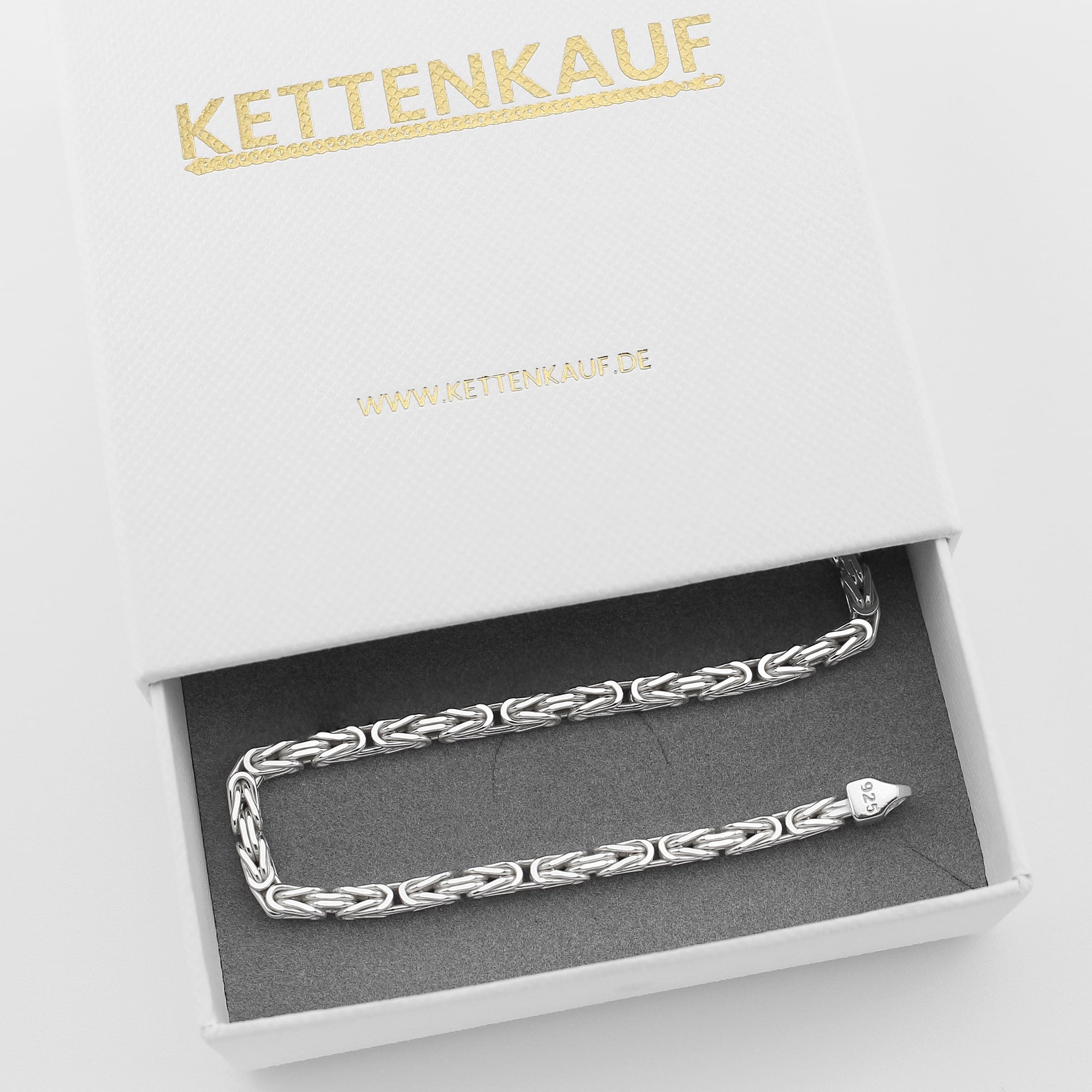 Massive Königskette (vierkant) mit 3mm Kantenbreite. Die Königskette besteht aus massivem 925er Silber und ist entsprechend gestempelt. Ein passender Karabinerverschluss und dezente Endkappen ergänzen die hochwertigen Kettenglieder und lassen keinen Zweifel an der Langlebigkeit der Königskette.