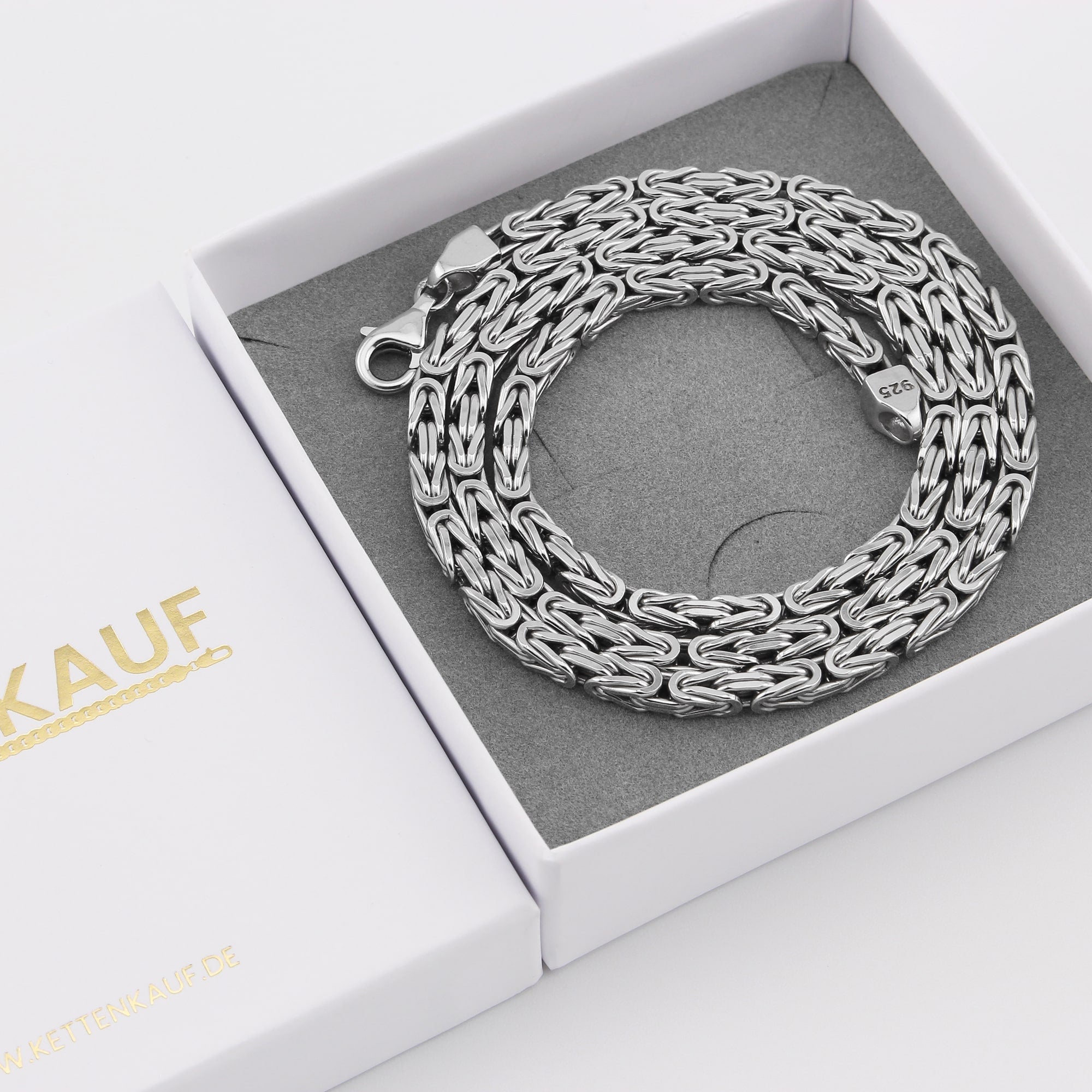 Massive Königskette (vierkant) mit 4mm Kantenbreite. Die Königskette besteht aus rhodiniertem massivem 925er Silber und ist entsprechend gestempelt. Ein passender Karabinerverschluss und dezente Endkappen ergänzen die hochwertigen Kettenglieder und lassen keinen Zweifel an der Langlebigkeit der Königskette.